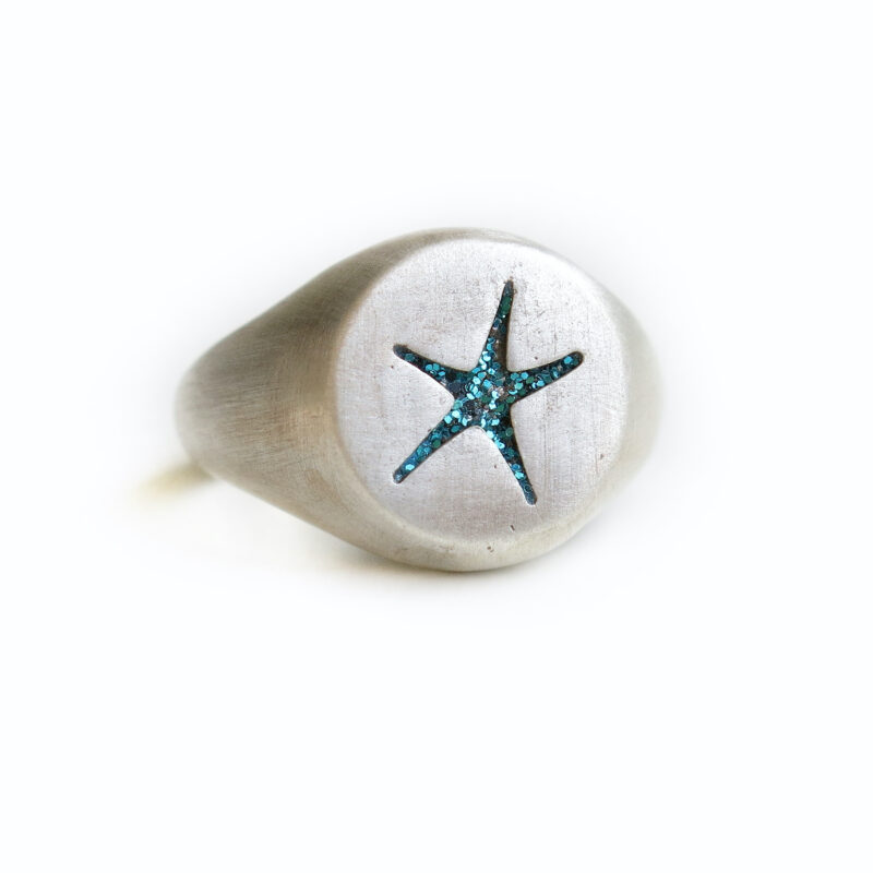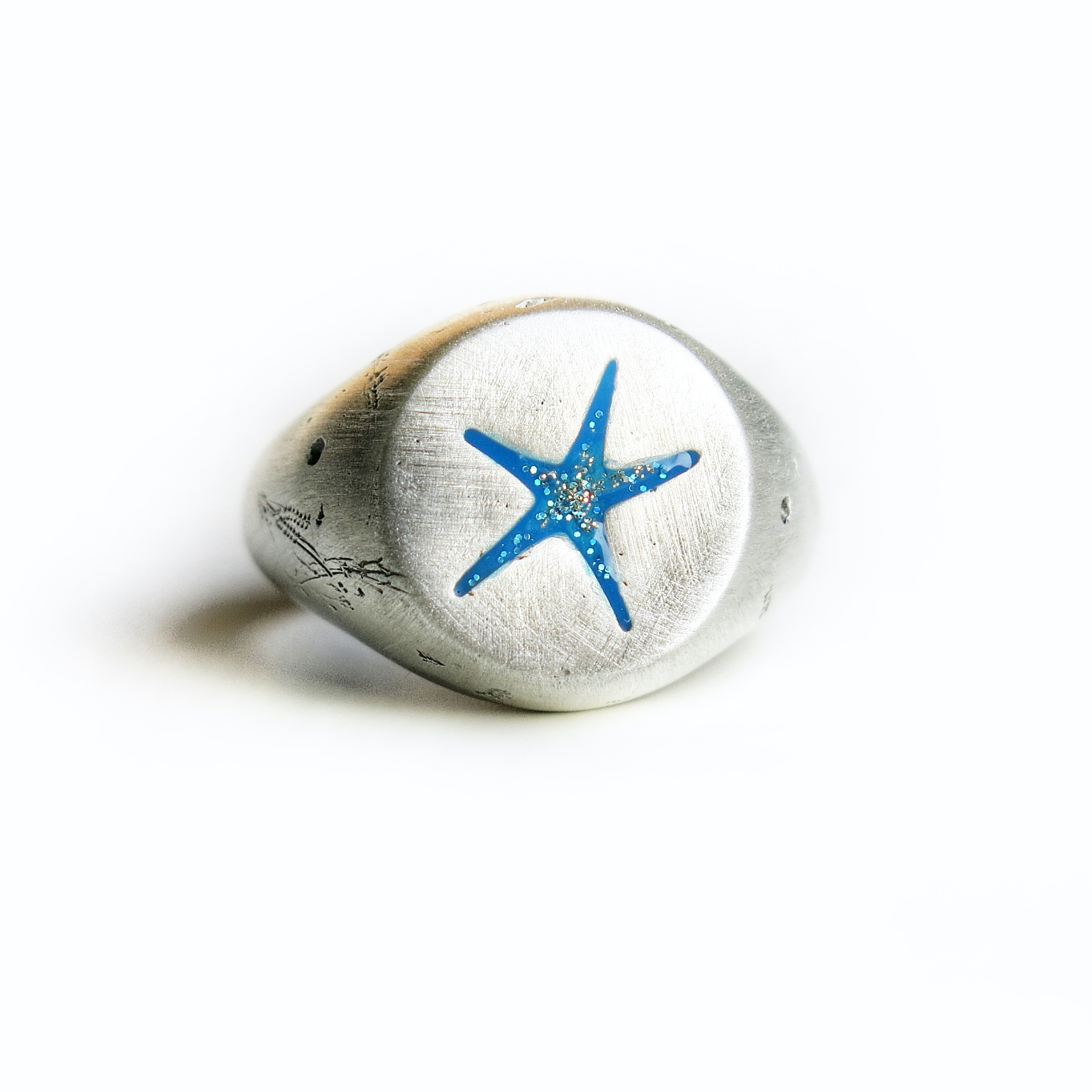 Anelli chevalier in argento spazzolato nelle due varianti, una più piccola, ed una più grande con effetto superficie più vissuta. Gli anelli sono disponibili in circa 20 giorni dall’ordine e sono regolabili. La variante chiusa e non regolabile è disponibile su richiesta da indicare nelle note dell’ordine. In questo caso i tempi di realizzazione potrebbero allungarsi di qualche giorno. E’ consigliata la variante piu piccola per misure fino alla 18 e la più grande oltre la misura 15. La stella pigmentata, a differenza di quella smaltata ha un trattamento che potrebbe subire danneggiamenti se l’anello non viene tolto per lavarsi le mani o se viene immenso in liquidi.