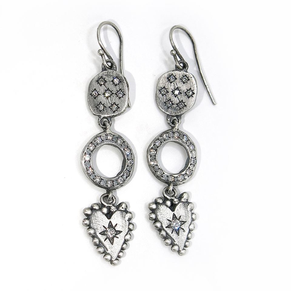 Orecchini in argento brunito con diamanti sintetici o zirconie. Lunghezza totale 6 cm dall’amo, peso 6/7gr cad
